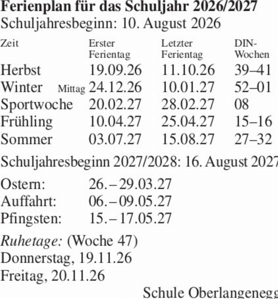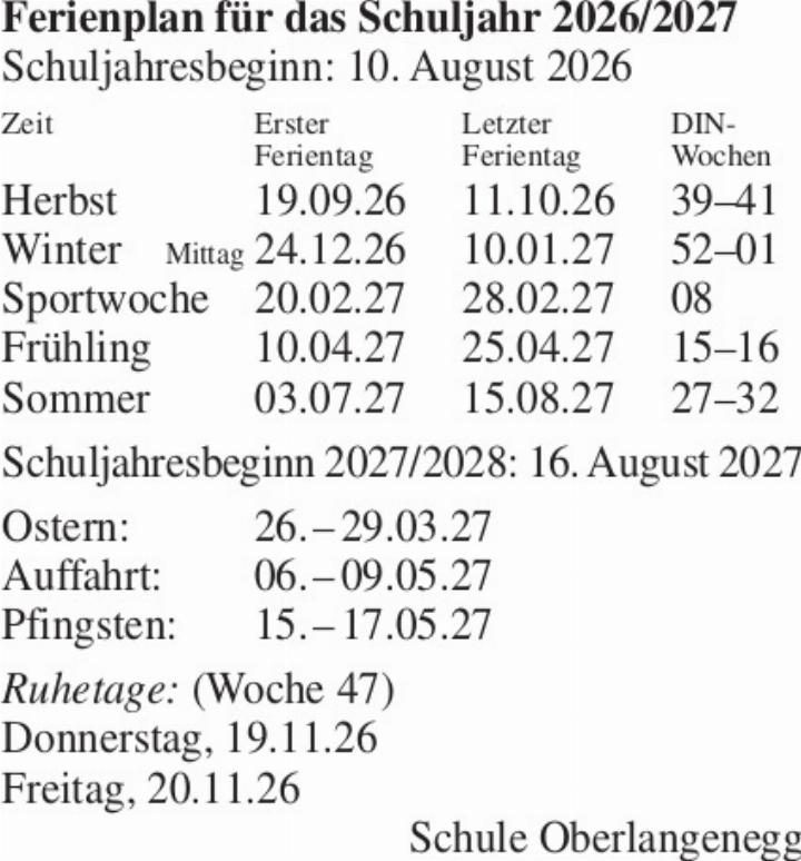 18.12.2025 OberlangeneggSchulpflichtig für das Schuljahr 2026/2027 werden Kinder,
