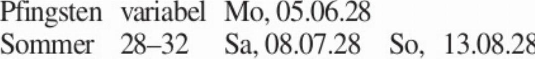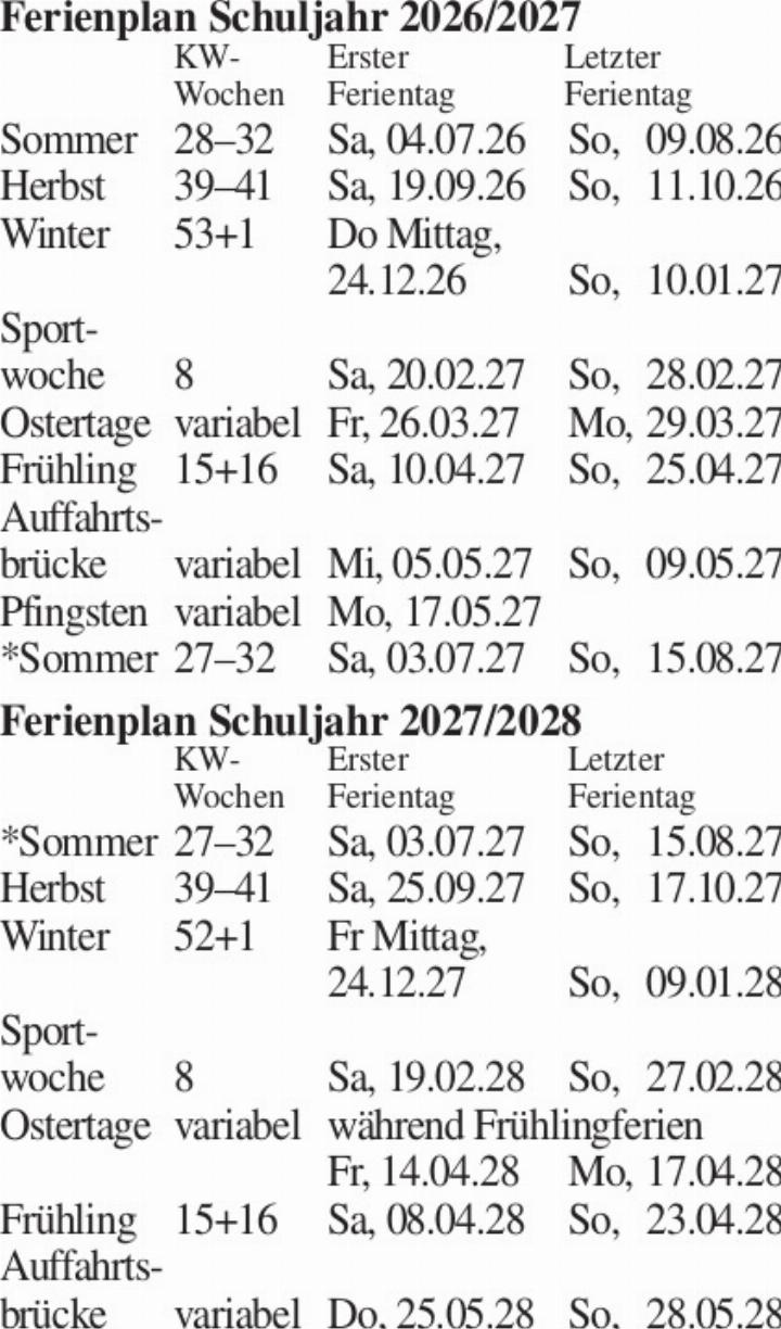 * Im Jahr, welches einem Jahr mit 53 Wochen folgt, dauern die Sommerferien sechs Wochen (Wochen 27 – 32), z.B. im Schuljahr 2026/27.
