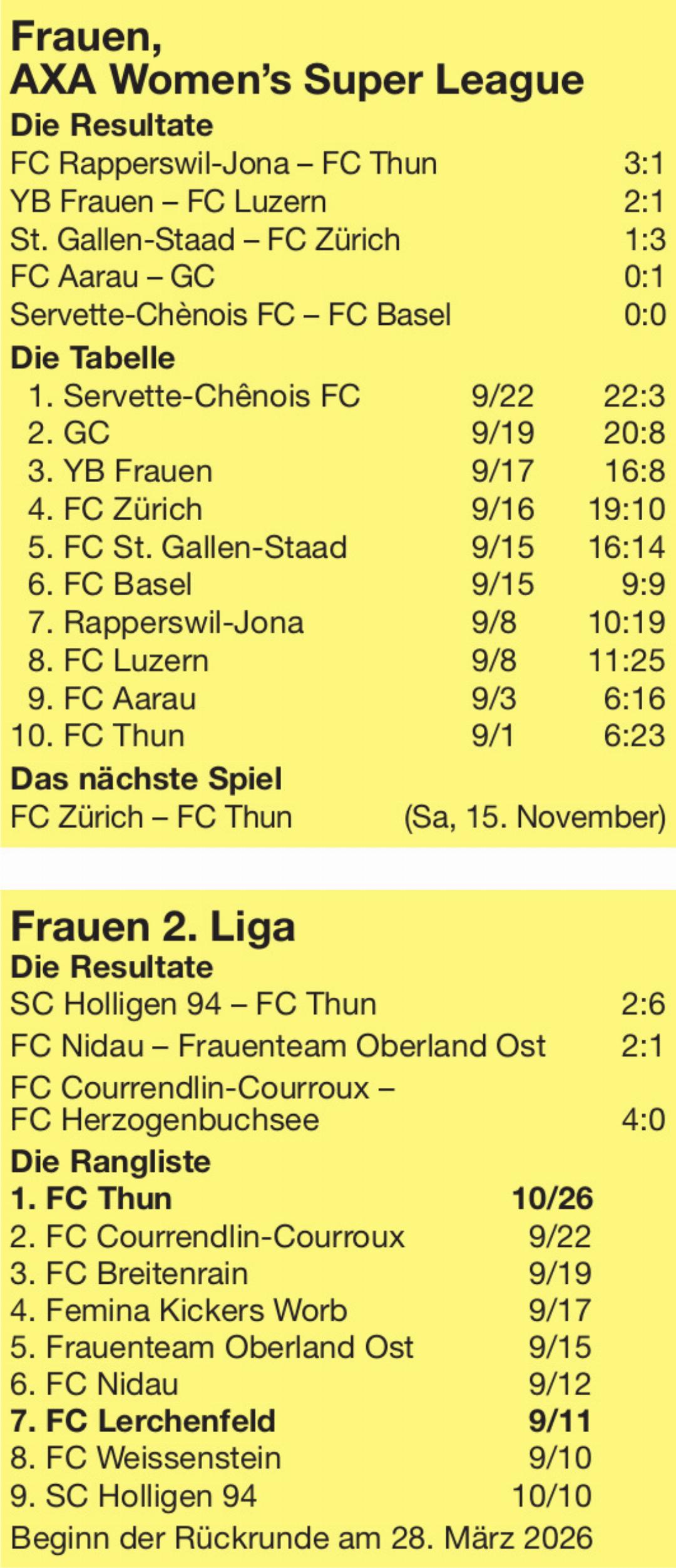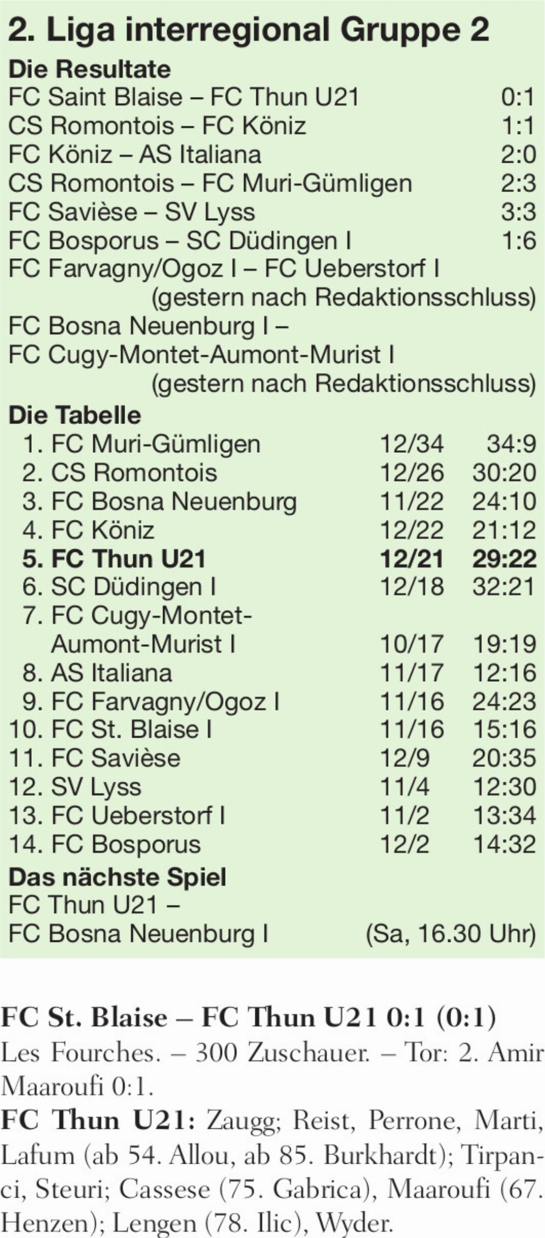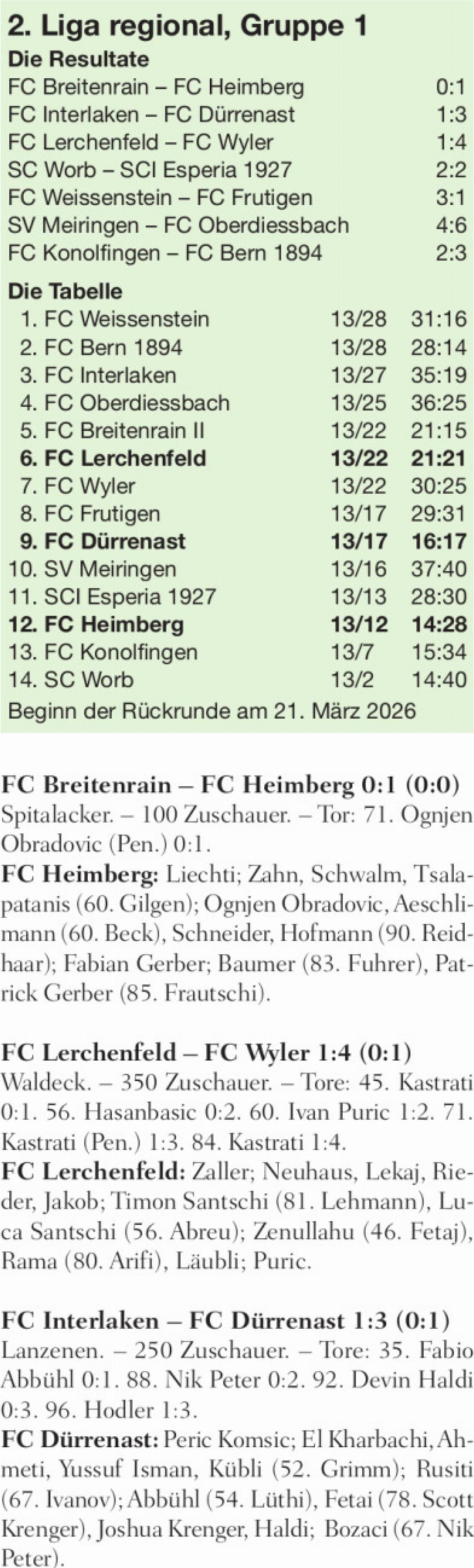Mit einem nicht erwarteten Sieg beim bisherigen Leader FC Interlaken schloss auch der FC Dürrenast die Vorrunde erfolgreich ab und stiess ins Mittelfeld vor. Weniger Glück hatte der FC Lerchenfeld, der dem immer stärker werdenden FC Wyler zuhause klar unterlag.