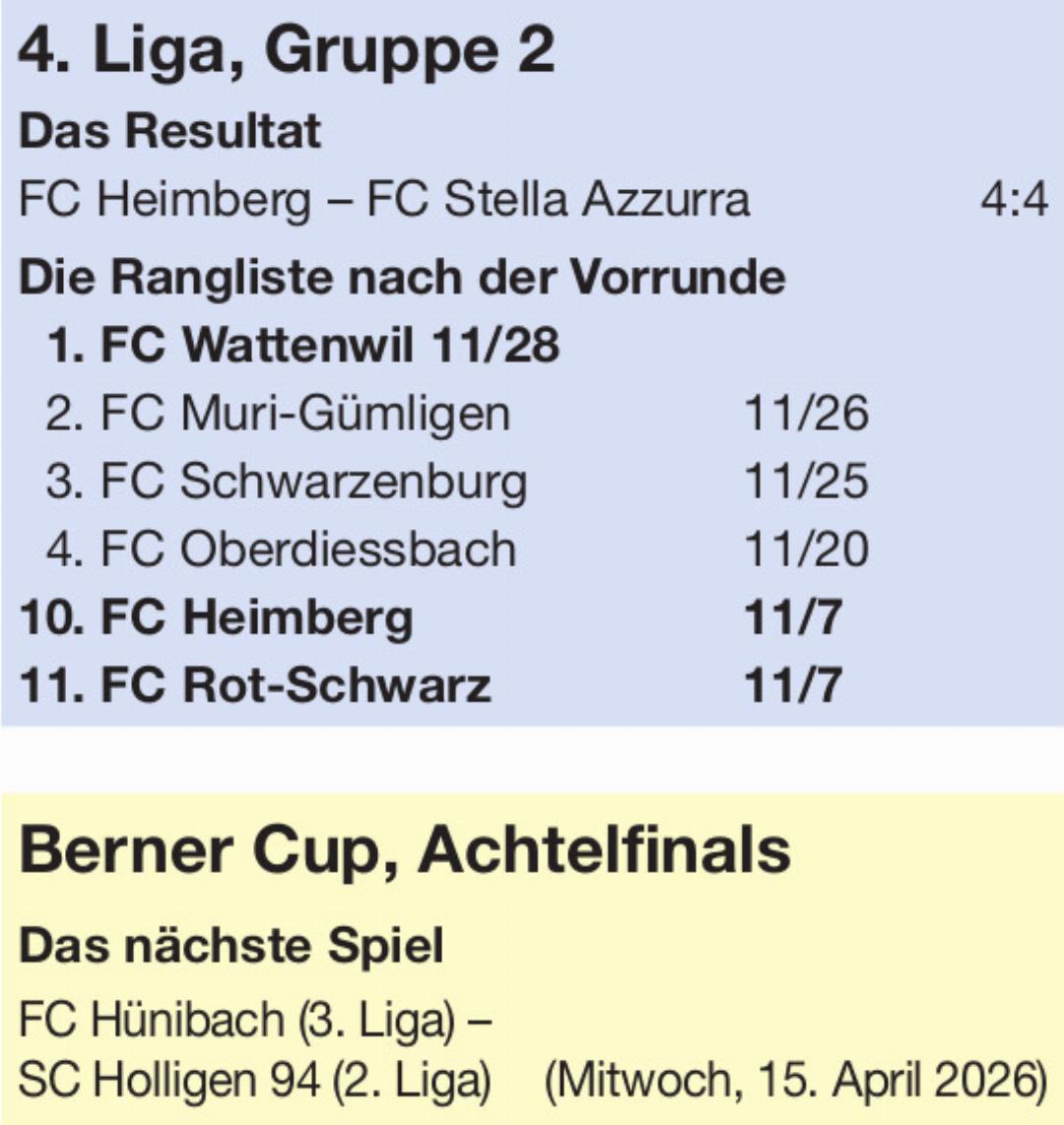 06.11.2025 Sport-ReportagenMit einem 1:0-Erfolg beim FC Breitenrain hat der FC Heimberg die Vorrunde erfolgreich abgeschlossen und darf der Fortsetzung der Meisterschaft nach der Weihnachtspause zuversichtlich entgegenblicken. Der Rückstand auf einen Nicht-Abstiegsplatz beträgt nach dem Überraschungssieg auf dem altehrwürdigen Spitalacker nur noch einen Punkt.