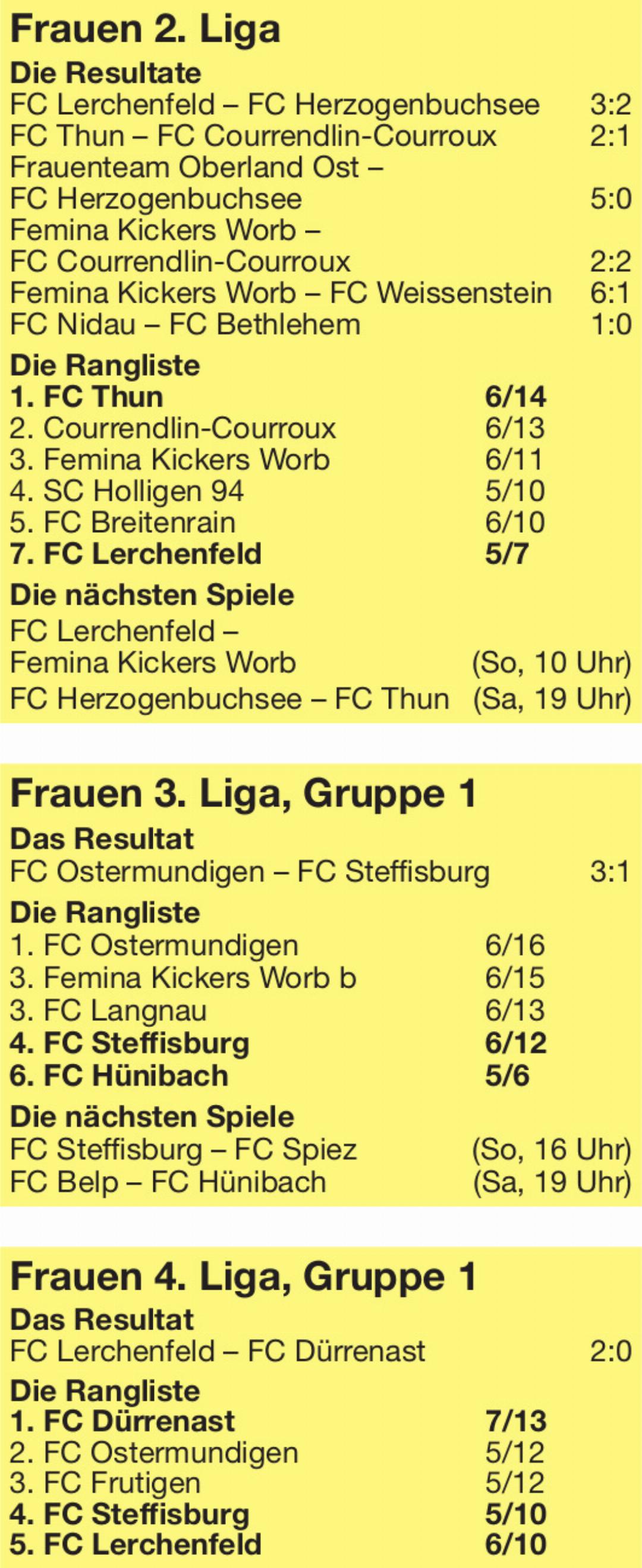 Neufeld. – 200 Zuschauer. – Tore: 27. Spycher 1:0. 63. Bazzi 2:0. 74. Sierra Abia 3:0.