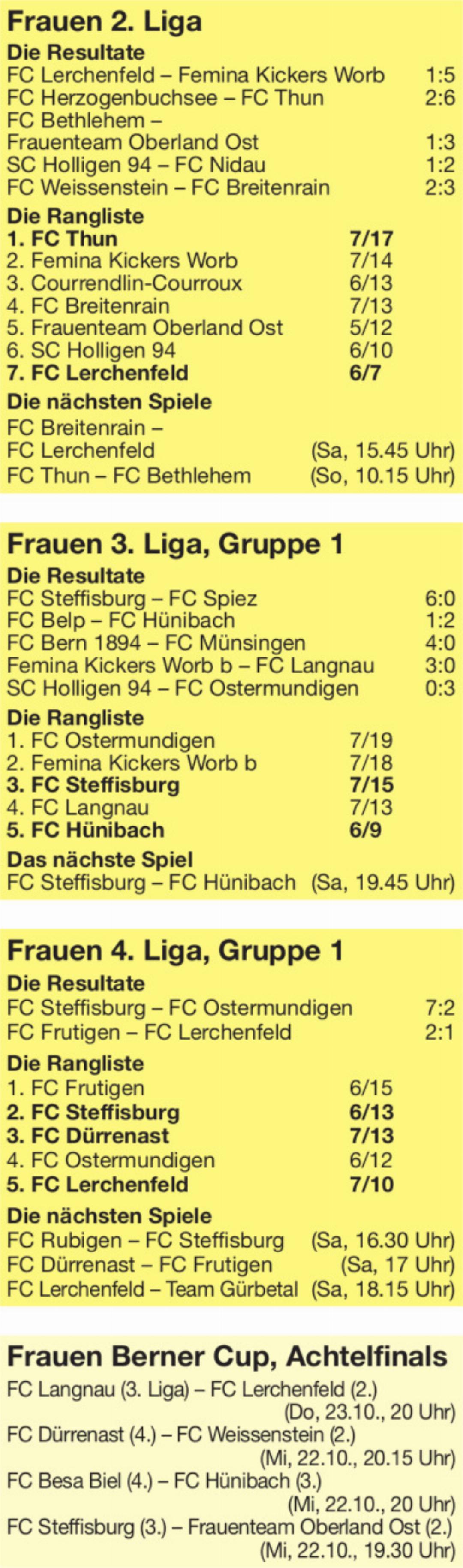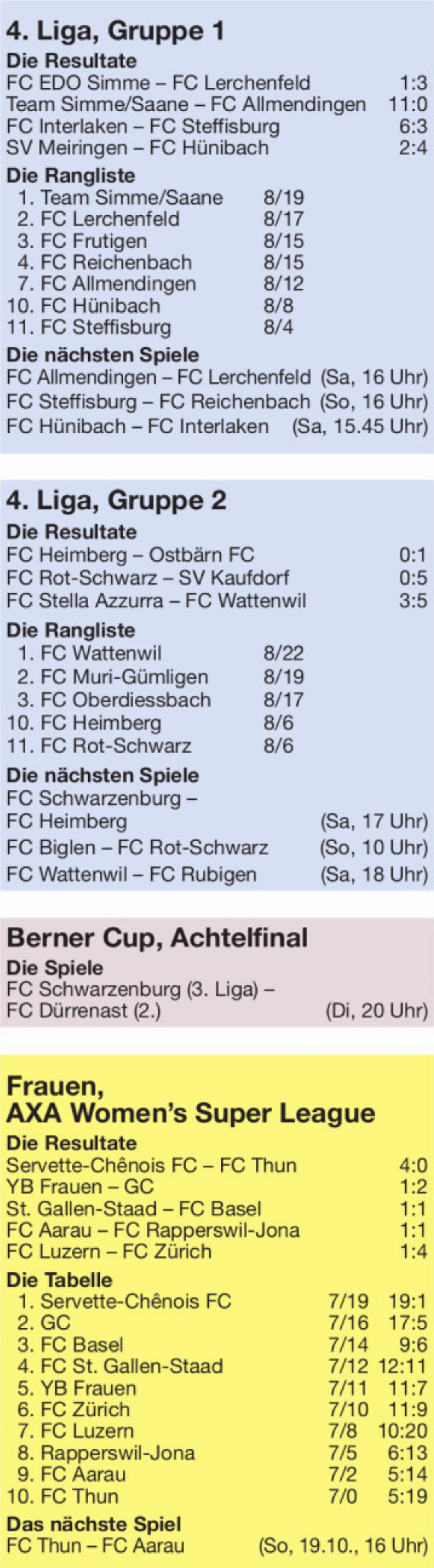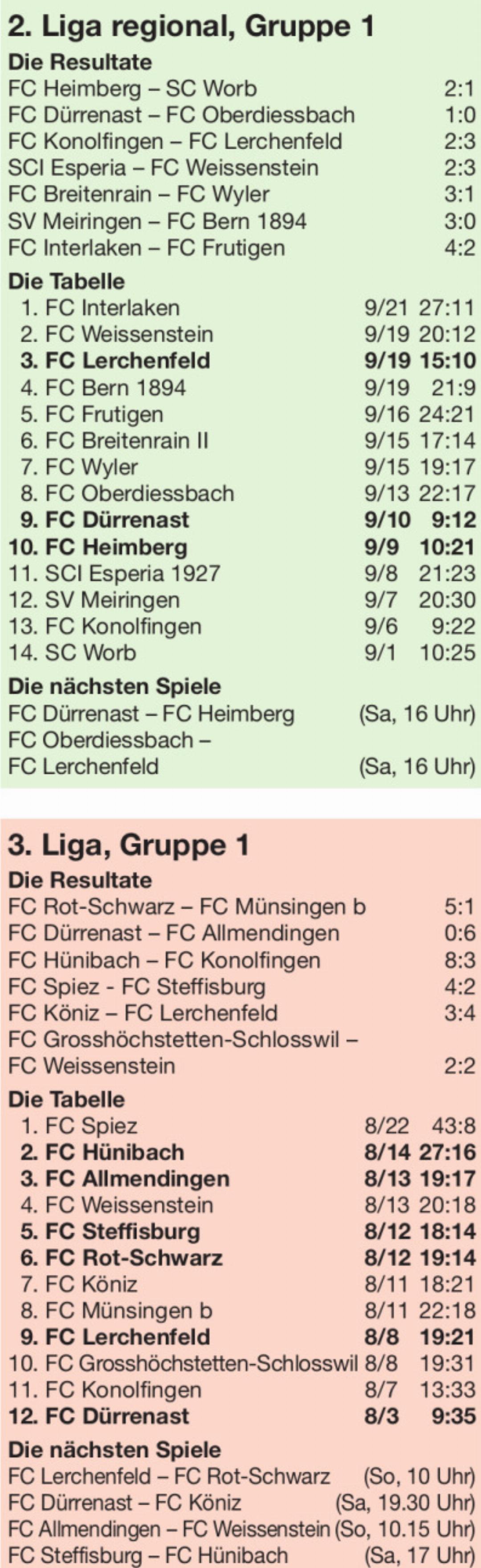 In der 2. Liga regional feierten alle drei Thuner Klubs Siege: Lerchenfeld nähert sich der Spitze, Dürrenast und Heimberg haben sich in den hinteren Tabellenregionen etwas Luft verschafft.