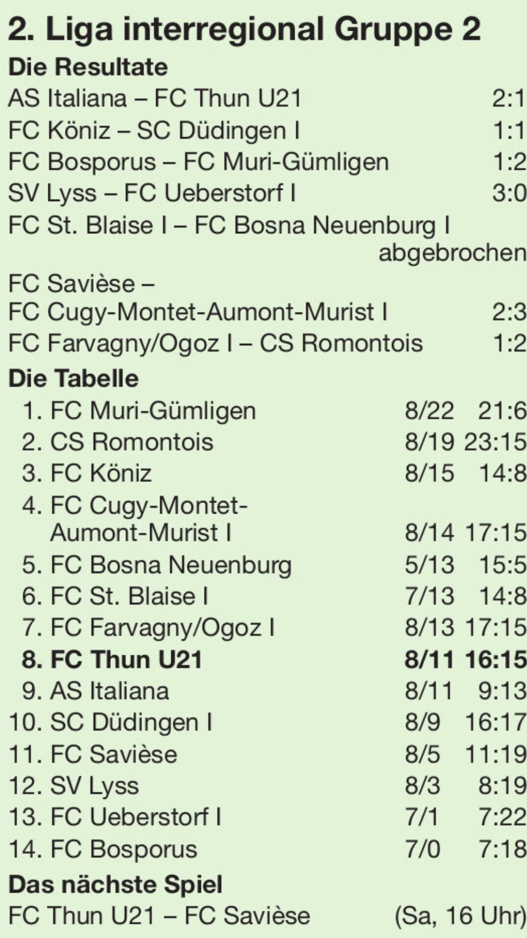 09.10.2025 Sport-ReportagenAufsteiger Rot-Schwarz Thun scheint sich auch in der 3. Liga wohlzufühlen. Von den ersten acht Begegnungen haben die Rot-Schwarzen nur deren zwei verloren und bei drei Unentschieden dreimal gewonnen, am Wochenende gleich mit 5:1 und damit Gegner Münsingen b in der Tabelle überholt. Erwähnenswert ist vor allem, dass es Rot-Schwarz bisher als einzigem Team gelungen ist, dem souveränen Leader und Aufstiegsfavoriten FC Spiez einen Punktverlust beizufügen.
