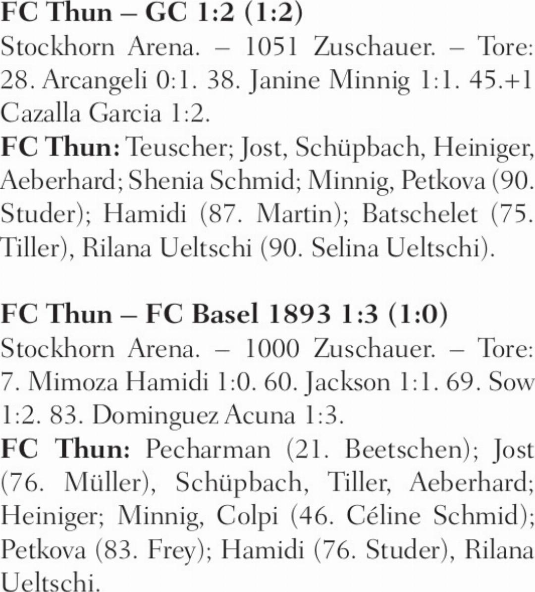 Die beiden letzten Meisterschaftsspiele haben die Thunerinnen verloren, obwohl sie zuerst in Führung lagen. Shenia Schmid kennt die Gründe für das Nachlassen nach der Pause. «Da ist einmal die Tatsache, dass wir nicht so breit aufgestellt sind wie die meisten anderen Teams und wir uns nach einer Führung zu sehr in die Defensive drängen lassen – ein Punkt, den wir verbessern wollen, zum anderen fehlt uns vielleicht auch die Kraft, weil wir nicht so viele Wechsel vornehmen können wie der Gegner.»