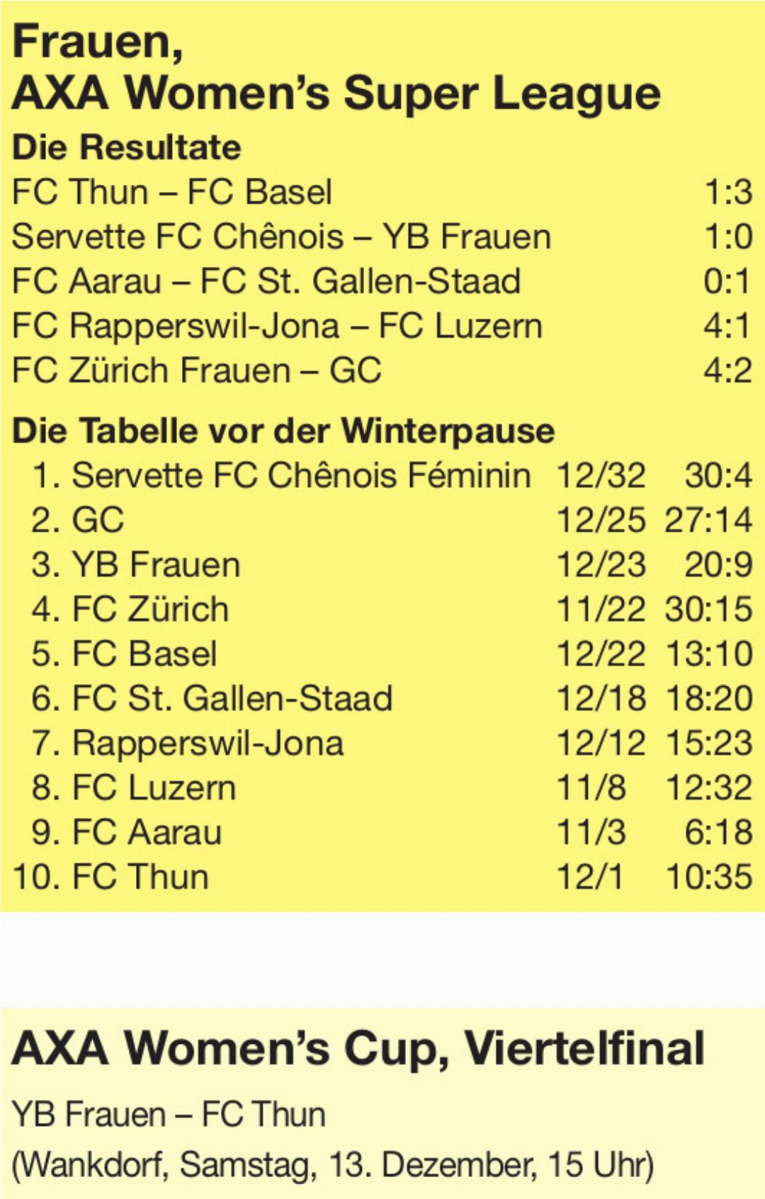 11.12.2025 Sport-ReportagenNur einen einzigen Punkt vermochten sich die Frauen des FC Thun bis zur Winterpause zu erkämpfen. Damit steht praktisch fest, dass die Thunerinnen den Ligaerhalt wie in den beiden letzten Saisons in der Abstiegspoule sicherstellen müssen. Mit einem neuen Trainer und viel Mut will das Team ab Anfang Februar die Weichen stellen, um auch in der kommenden Saison erstklassig zu spielen.