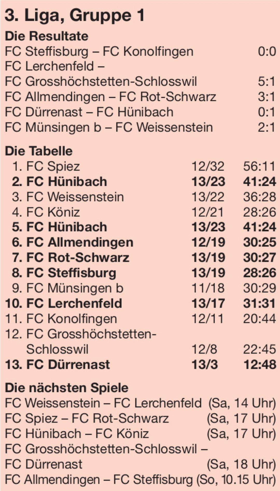 In der 3. Liga beeindruckt der FC Hünibach. Das Team, das in der letzten Saison aus der 4. Liga aufgestiegen ist, belegt mit Trainer Pero Markovic Rang 2 hinter dem überragenden Leader FC Spiez.