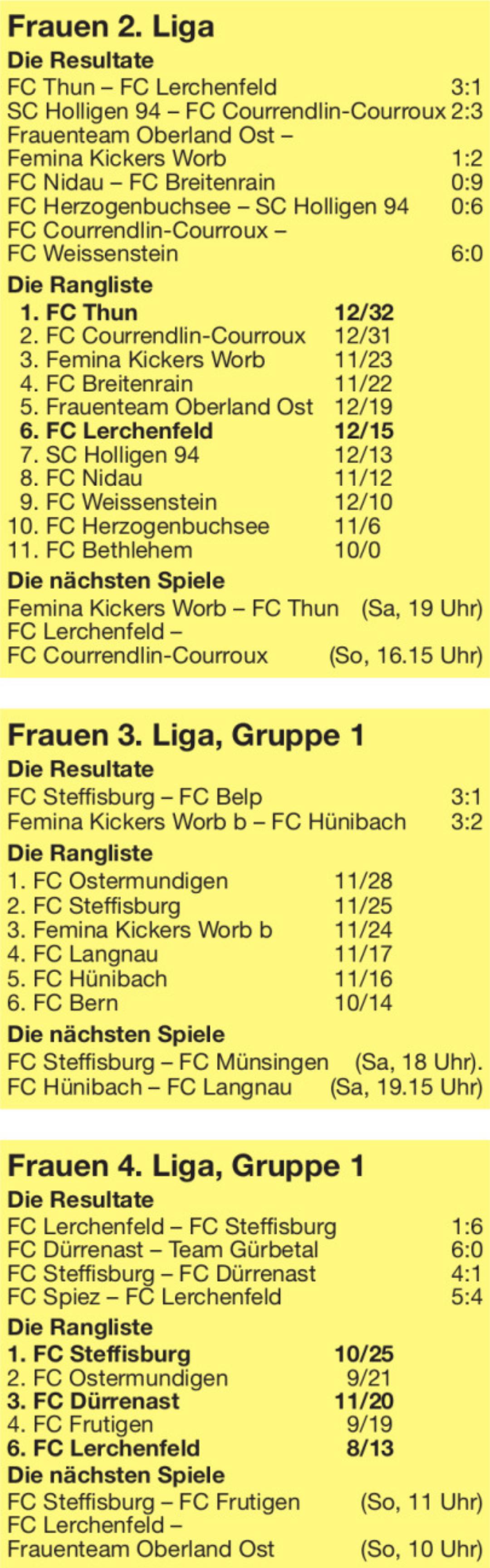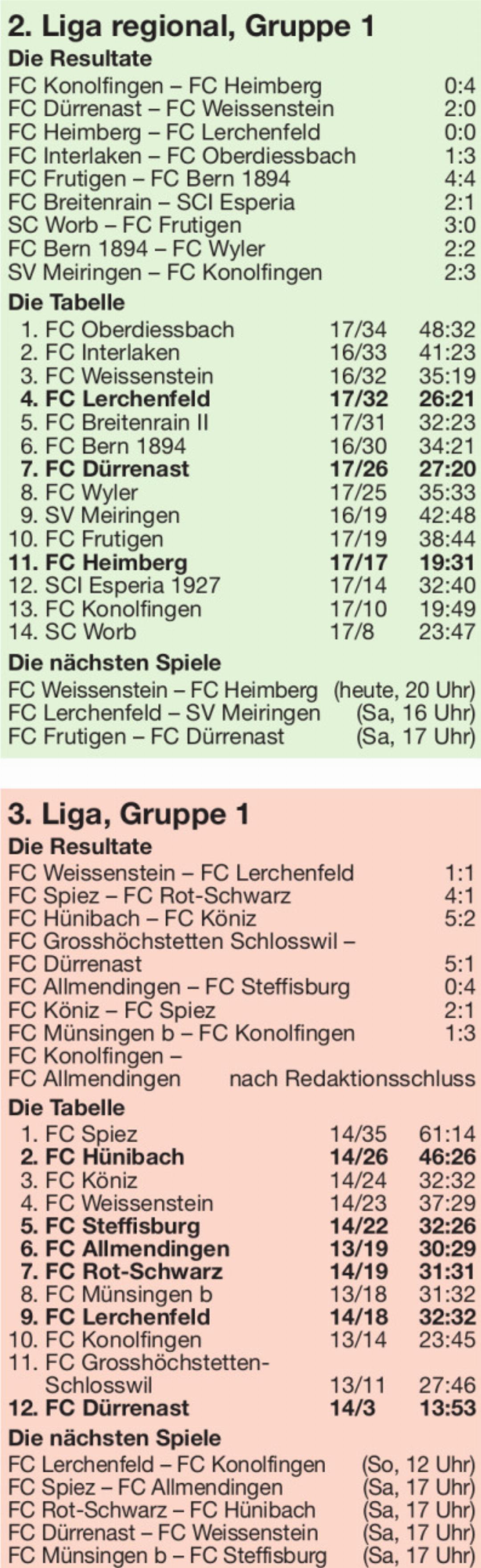 Die jungen, spielerisch starken Lerchenfelder besassen zwar deutlich mehr Ballbesitz, doch dank einer solidarischen Abwehrarbeit erkämpften sich die Heimberger einen verdienten Zähler. «Wir besassen zwar zwei gute Torchancen, doch alles in allem war Lerchenfeld überlegen. Wir versuchten mit Konterangriffen zu Chancen zu kommen, so wie wir uns das vorgenommen hatten», sagte Heimbergs Coach Dominic Aeschbacher nach dem Spiel. Wegen Verletzungen und Sperren stand Heimberg nur ein Rumpfkader zur Verfügung. Aeschbacher setzte sogar einen B-Junioren ein – umso bemerkenswerter die Tatsache, dass das Team erneut keinen Gegentreffer einstecken musste und jetzt nicht mehr auf einem Abstiegsplatz liegt.