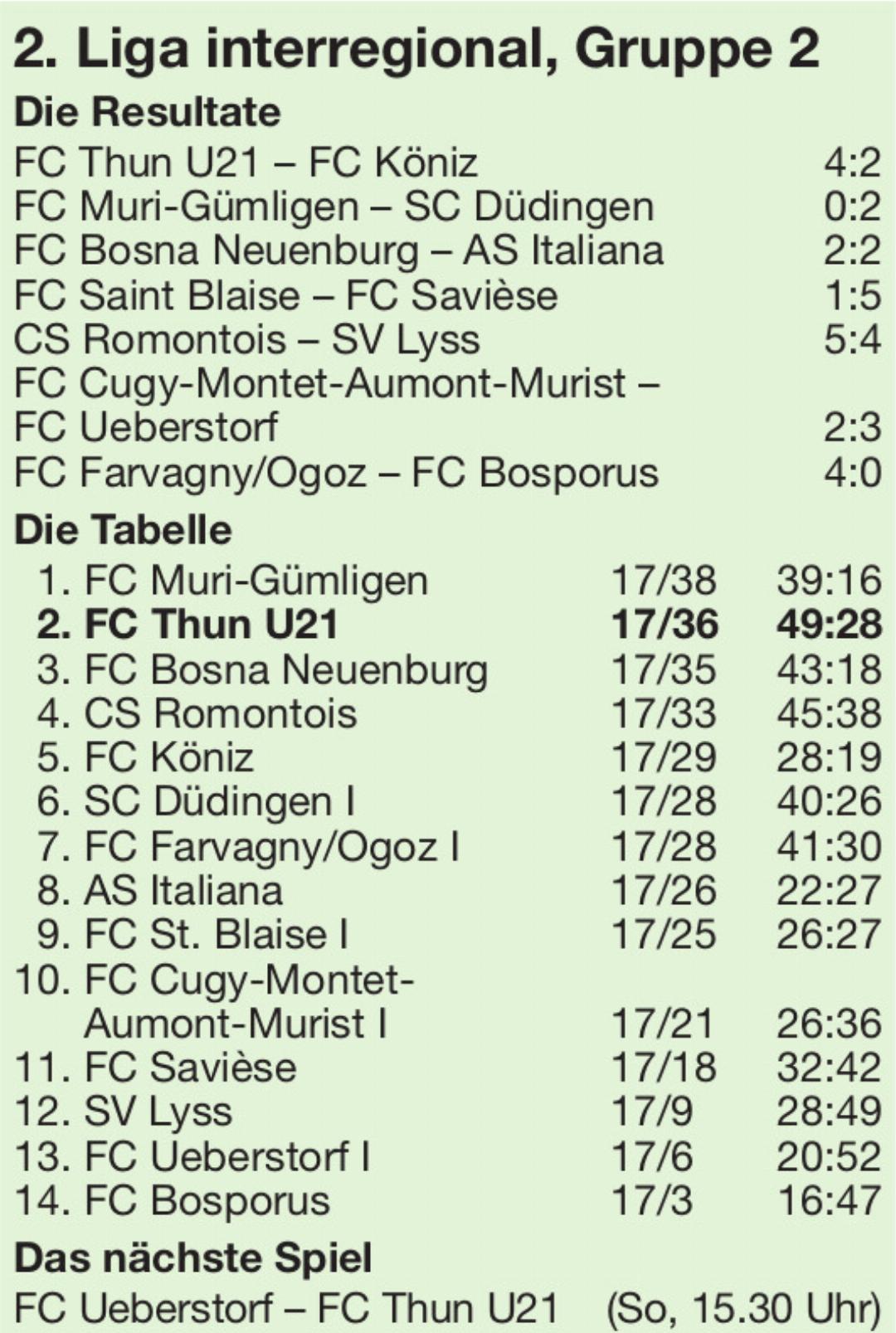 Seit dem 11. Oktober, seit sieben Monaten und neun Spielen, ist die U21 des FC Thun ungeschlagen und rückt in der 2. Liga interregional immer näher zu Leader FC Muri-Gümligen auf. Diesmal hatte der aufstrebende FC Köniz das Nachsehen. Wie bereits im letzten Match gegen Cugy-Montet-Aumont-Murist schoss Simon Lengen zwei Tore. Er führt die Torschützenliste der Gruppe 2 mit 12 Treffern an.