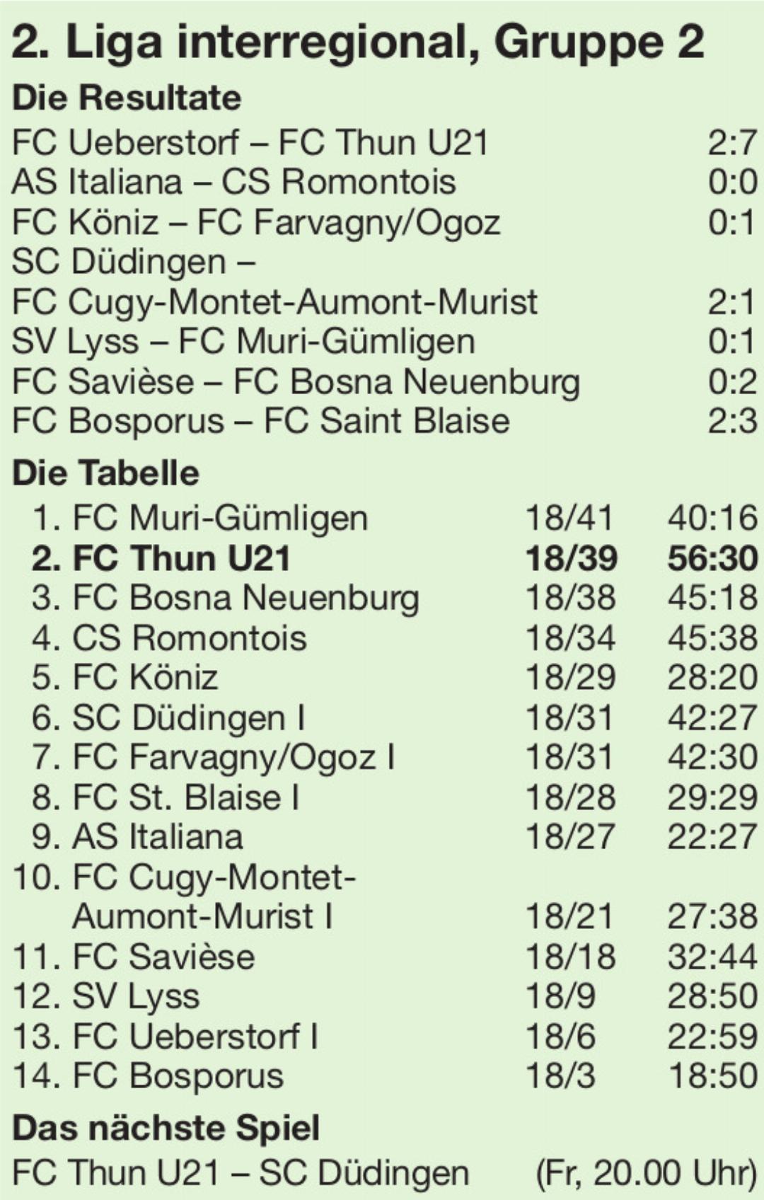 Die U21 des FC Thun ist in diesem Jahr nicht aufzuhalten und reiht Sieg an Sieg. Gegen den Tabellenvorletzten FC Ueberstorf teilten sich sieben Schützen die sieben Torerfolge – ein Beispiel für die Ausgeglichenheit im Team von Cheftrainer Daniel Gygax. Der einst souveräne Leader FC Muri-Gümligen liegt zwar weiterhin zwei Punkte vor den Thunern, doch ist Thuns U21 derzeit deutlich stärker einzuschätzen.