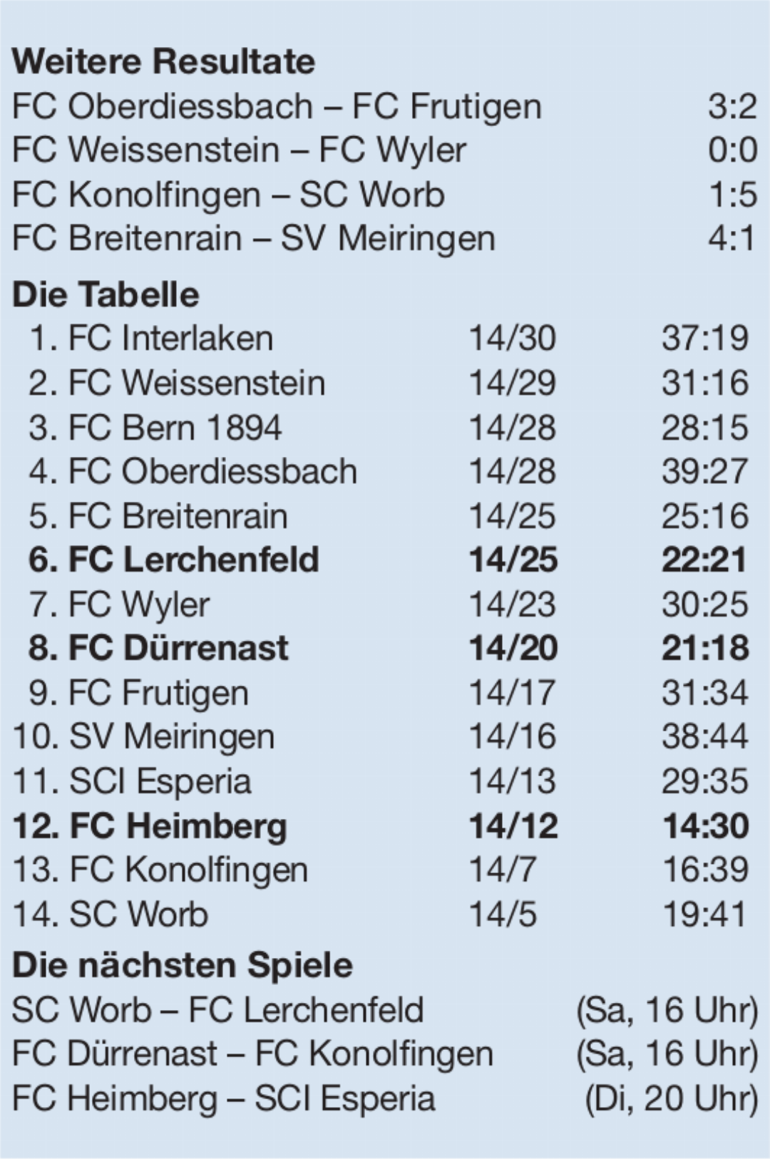 FC Heimberg: Eschler; Fischer, Zahn, Obradovic (58. Eschler), Gilgen; Beck (73. Wieland), Gerber, Schneider (80. Fuhrer); Gonzalez (61. Schwalm), Baumer, Wyttenbach.