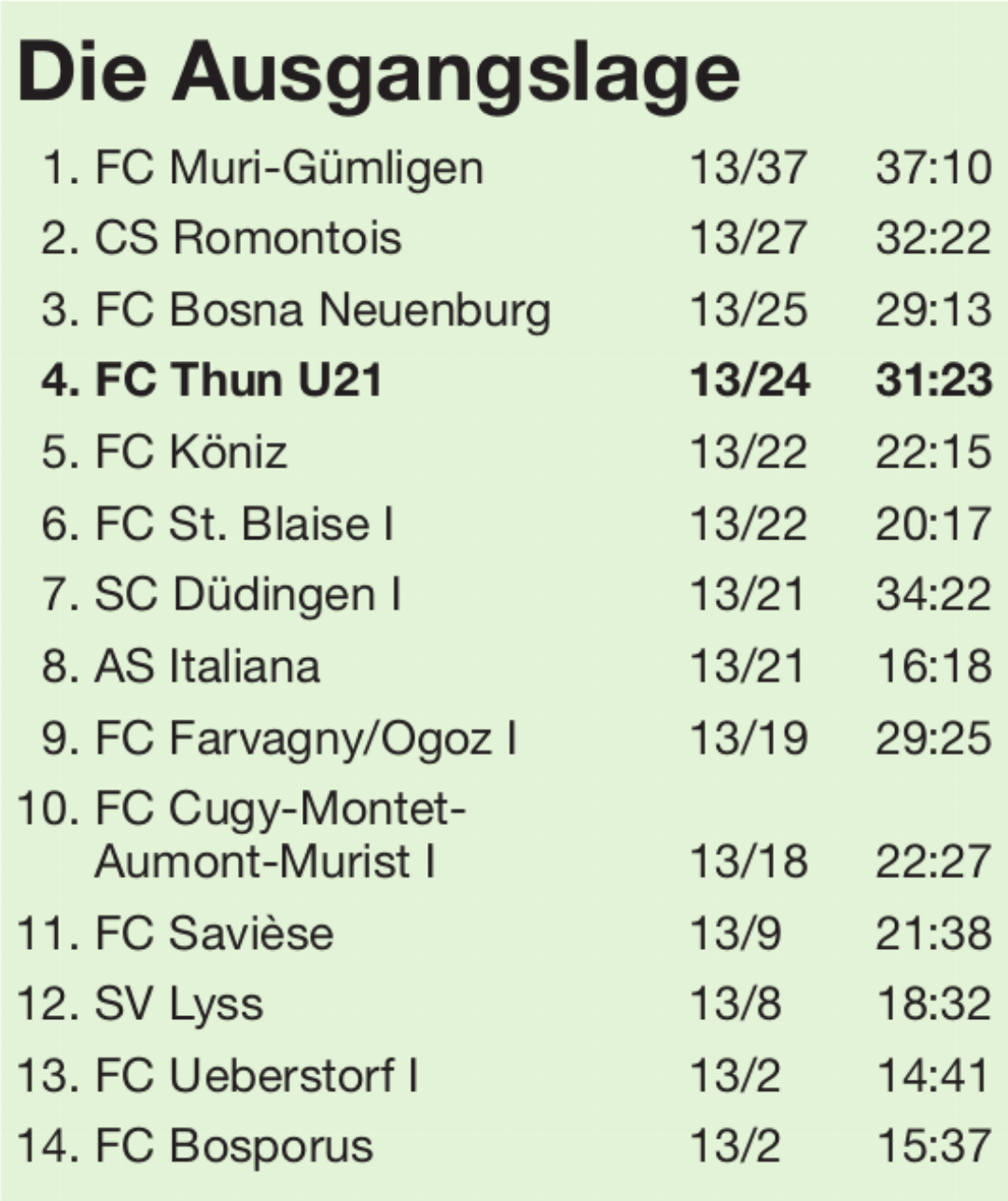 Daniel Gygax erwartet von seinen Spielern in der Rückrunde eine weitere Steigerung. «Unser Ziel ist es, die Entwicklung nach oben fortzuführen, mit der Mannschaft wollen wir uns weiter nach vorne arbeiten und mit den einzelnen Spielern Fortschritte erzielen», sagt Gygax. «Wir wollen den Schwung aus den letzten Begegnungen der Hinrunde mitnehmen und gut aus den Startlöchern kommen.» Leicht wird der Beginn für die Thuner U21 nicht sein. Zuerst wartet das Heimspiel gegen den Tabellenzweiten CS Romontois, dann folgt die Auswärtspartie beim souveränen Leader FC Muri-Gümligen im Stadion Füllerich in Gümligen. «Nach diesen beiden Partien werden wir sehen, in welche Richtung es geht», sagt Gygax, der mit seinem Team bereits in der zweiten Januarwoche ins Training gestiegen ist, obwohl die Meisterschaft erst übermorgen Samstag wieder aufgenommen wird.