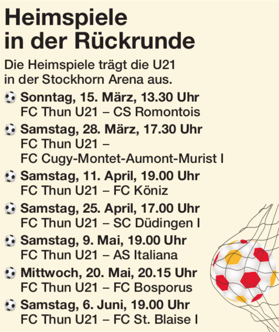 12.03.2026 Sport-ReportagenIm Thuner Fussball hängt der Himmel derzeit voller Geigen. Das Fanionteam des FC Thun reiht Sieg an Sieg, der Nachwuchs in der 2. Liga interregional überzeugt nach starken Darbietungen in der Vorrunde mit guten Leistungen in der Vorbereitung zur Rückrunde und auch die Frauen lassen nach dem Sieg beim FC Luzern und dem Heim-Unentschieden gegen St. Gallen hoffen, dass der Ligaerhalt geschafft werden kann.